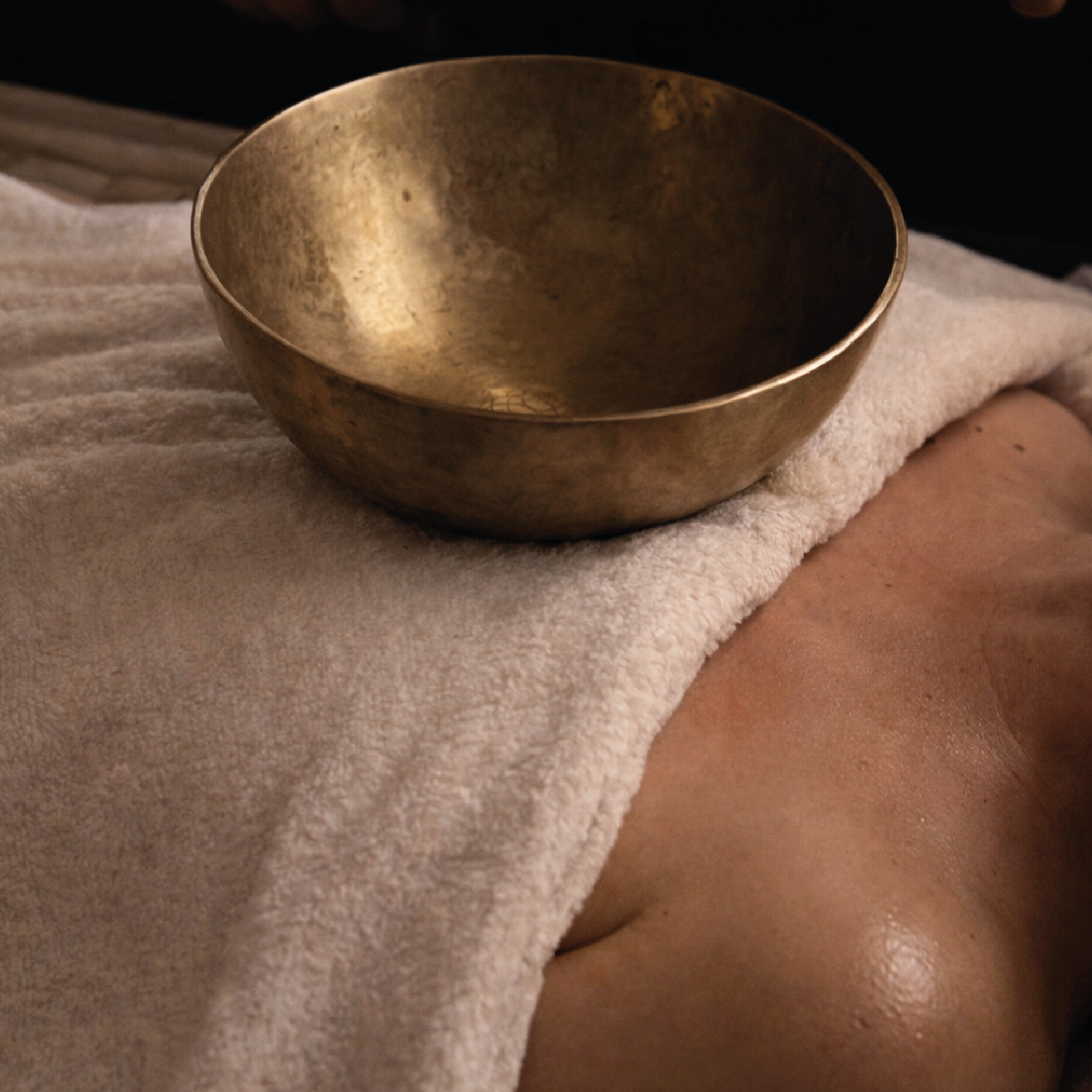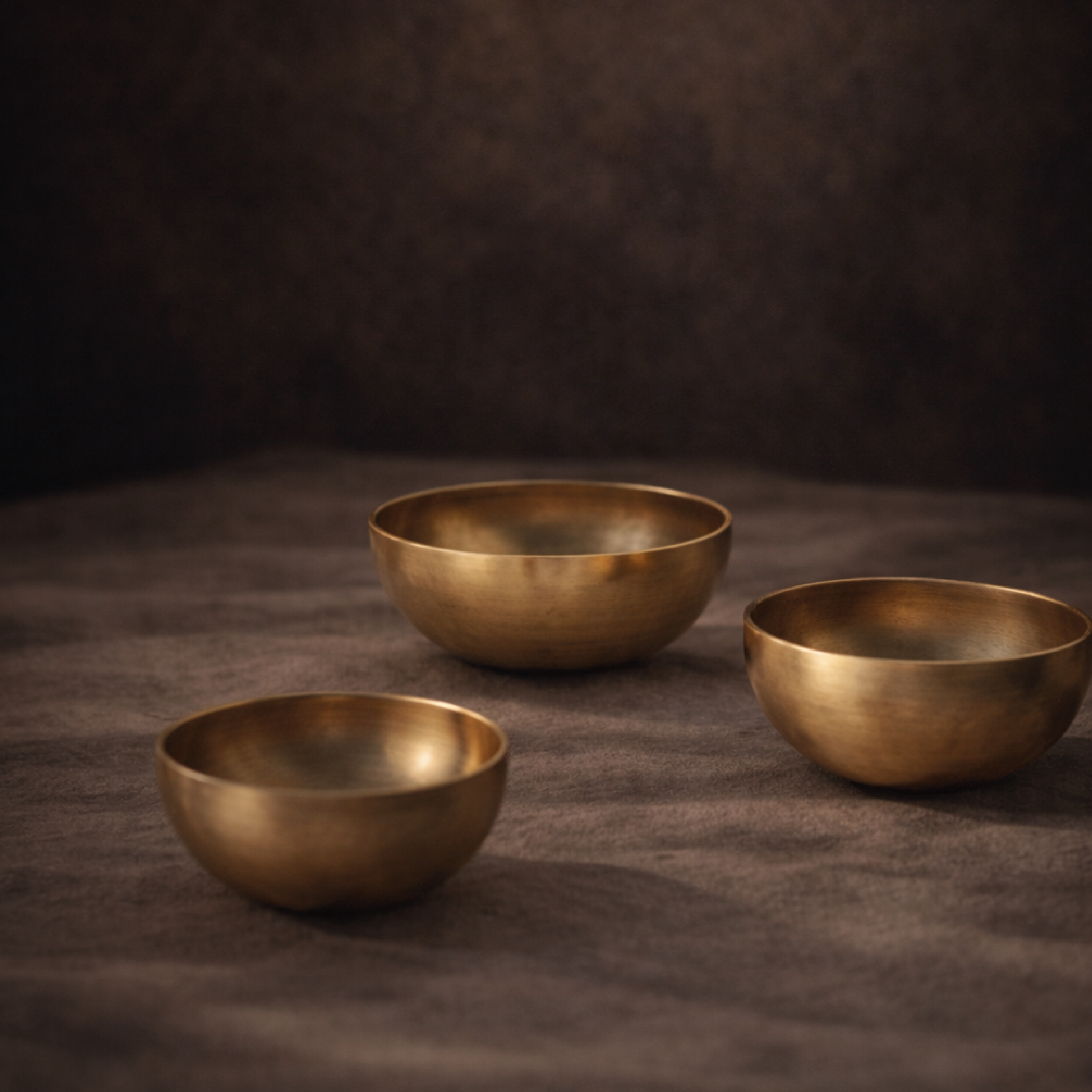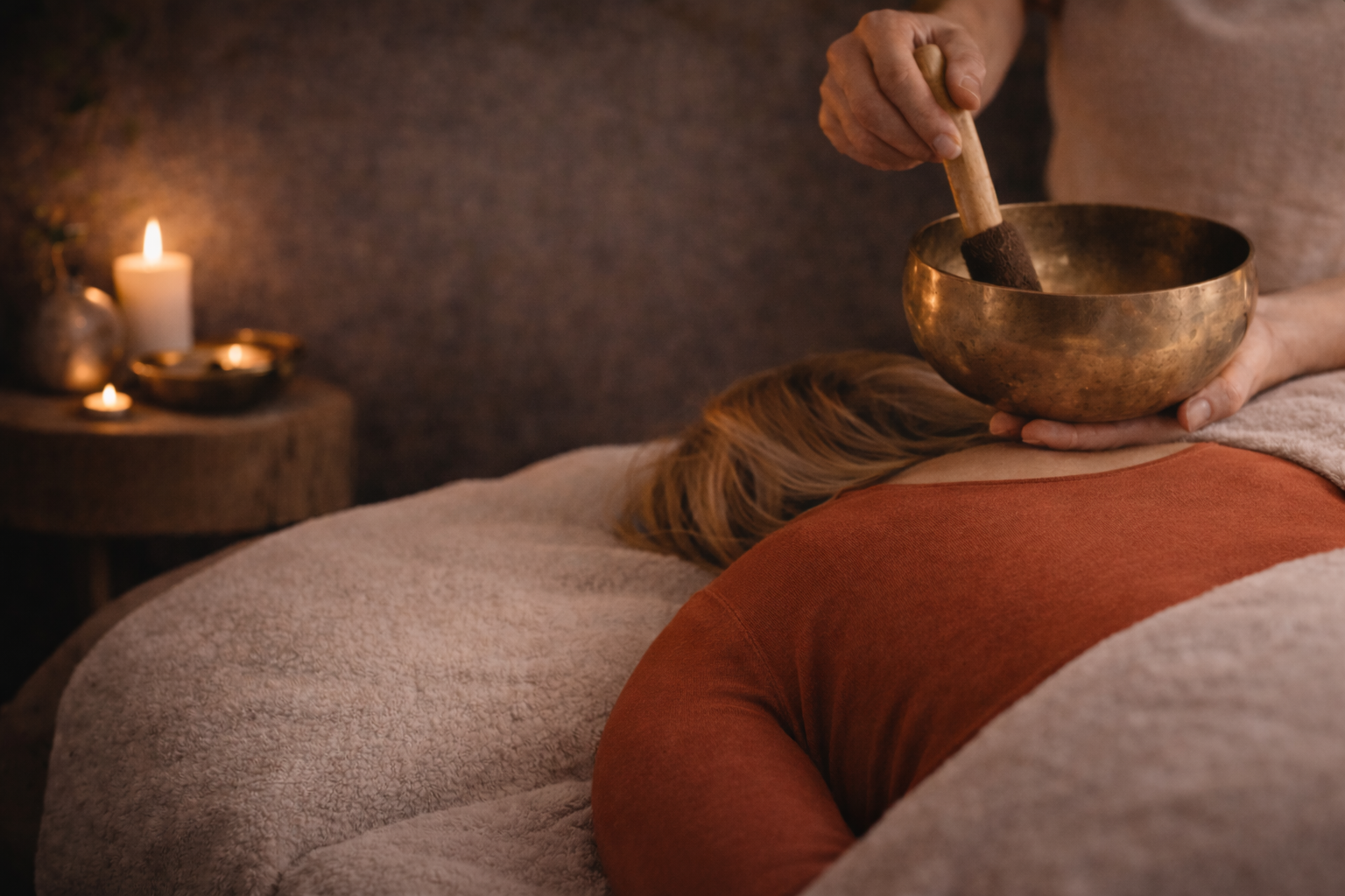 Sorgfältig ausgewählte therapeutische Klangschalen werden auf und um den Körper platziert und sanft in Schwingung versetzt.