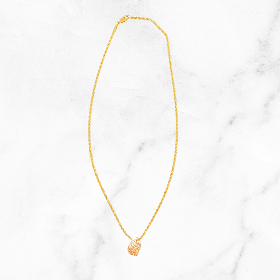 Diese Halskette kombiniert eine echte, sorgfältig ausgewählte Muschel mit einer eleganten, vergoldeten Kordelkette. Jedes Stück ist ein Unikat, so individuell wie die Gezeiten selbst.